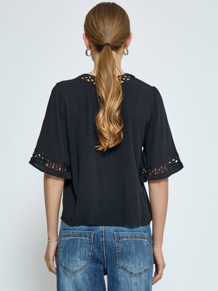 Кружевная блузка DSLina от Desires - изысканное изделие, гармонично сочетающее элегантность и комфорт. Изготовленная из чистой вискозы, эта блузка отличается роскошной мягкостью и струящейся драпировкой, которая подчеркивает каждый силуэт. Изящная кружевная отделка подчеркивает изысканный V-образный вырез, добавляя нотку женственности и изящества. Широкие, развевающиеся рукава спускаются по рукам и украшены изысканным кружевом на манжетах, перекликающимся с дизайном выреза. Идеально подходит как для повседневных выходов, так и для вечерних мероприятий. Дополните ее любимыми джинсами или элегантной юбкой-карандаш, чтобы создать элегантный и вневременной ансамбль.