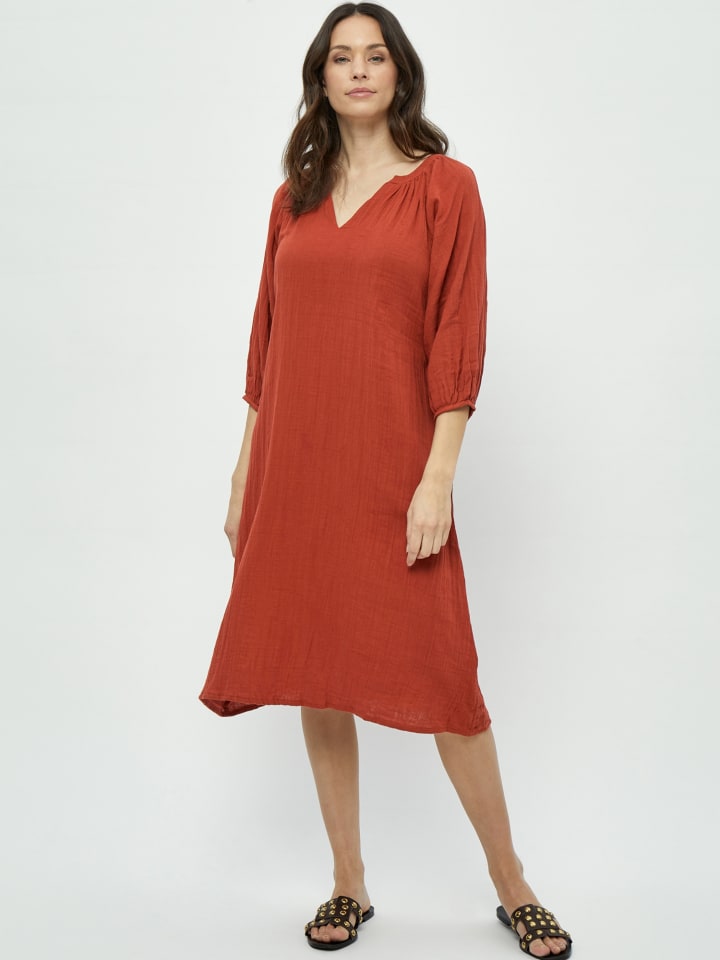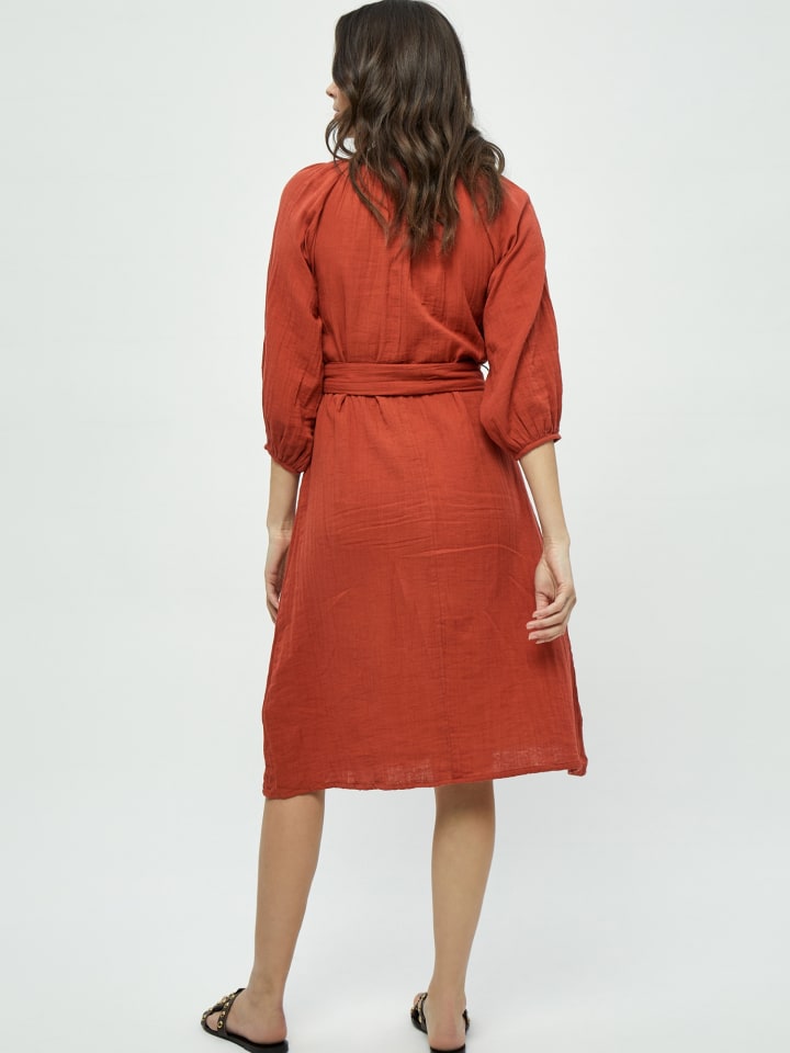 Платье Clara изготовлено из 100% хлопка, комфортного и дышащего материала. Длина платья ниже колена, рукава 3/4 и V-образный вырез. Пояс с деталями на концах создает изящный силуэт.
