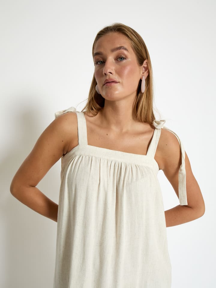 Ощутите непринужденную элегантность в льняном платье DSNatalie с короткими бретельками от Desires. Изготовленное из роскошной смеси вискозы и льна, это платье дарит ощущение воздушности и идеально подходит для солнечных дней. Квадратный вырез красиво подчеркивается изящными завязками на плечах, добавляя нотку женственности и обеспечивая регулируемый комфорт. Свободный крой струится изящно, обеспечивая стиль и комфорт при каждом шаге. Дополните его любимыми босоножками для создания шикарного дневного образа или дополните эффектными украшениями для вечернего выхода. Прогуливаясь по городу или отдыхая в пляжном кафе, это платье - ваш выбор для создания вневременной изысканности.