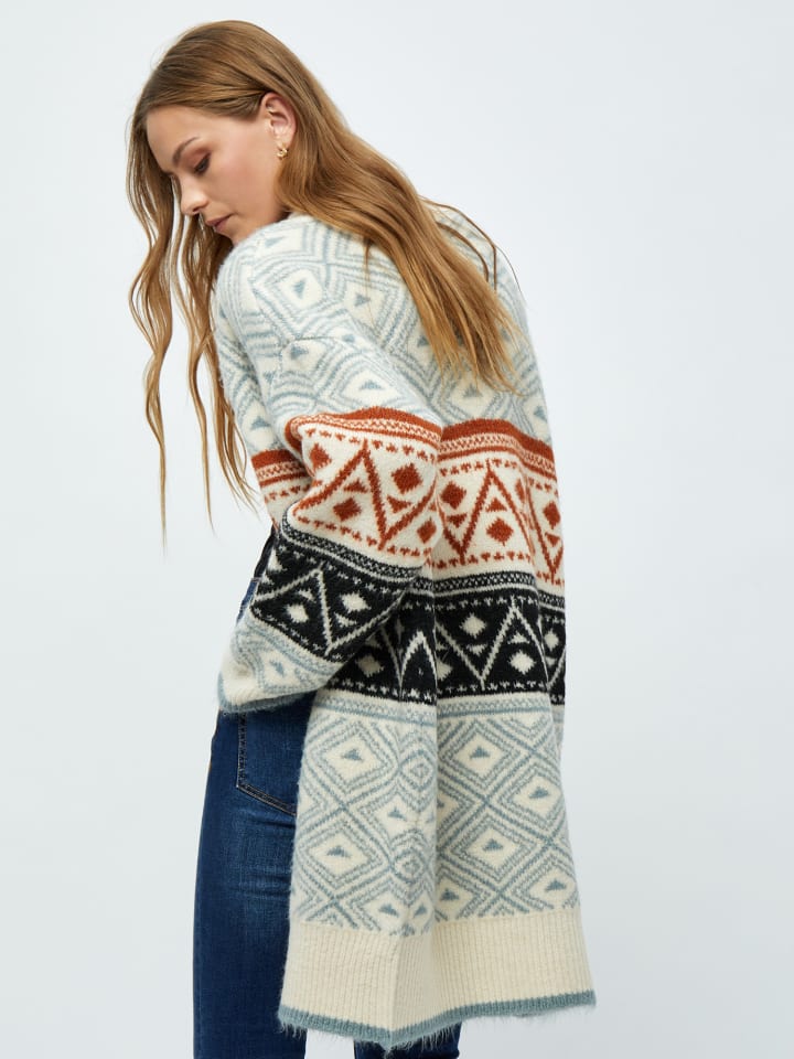 Кардиган Fija изготовлен из плотной и мягкой ткани, что делает его теплым и комфортным. Кардиган длинный, с ребристыми краями. Узор в стиле ацтеков гармонично сочетается с цветами.