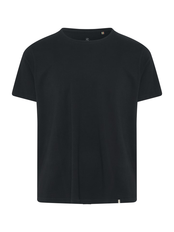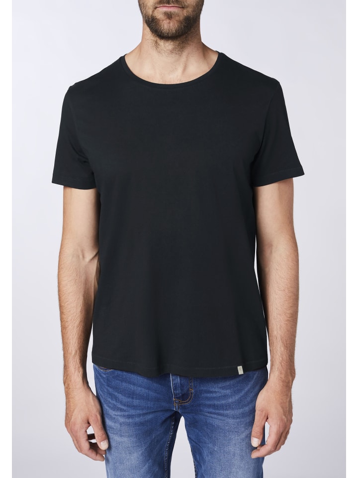 - Контрастный круглый вырез и нашивка с логотипом на подоле спереди