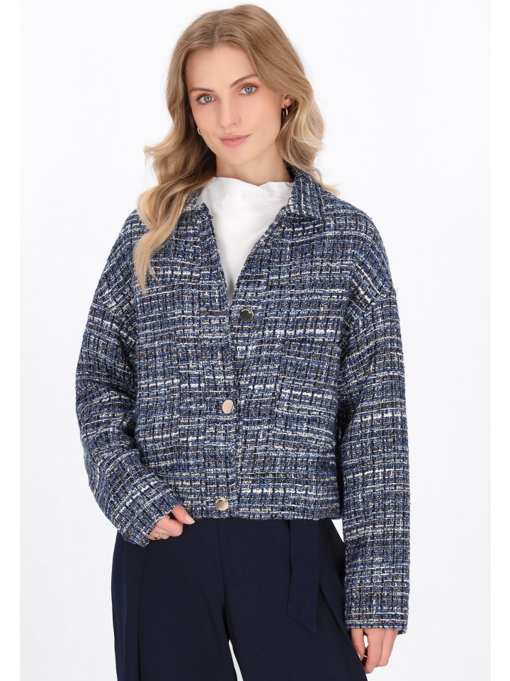 Откройте для себя эту укороченную куртку из ткани букле с меланжевым узором, которая неподвластна времени. Классический воротник и застежка на пуговицы спереди дополнены длинными рукавами со спущенной линией плеча для свободного кроя. Простой силуэт сочетает в себе элегантность и непринужденность, идеально сочетаясь с брюками с высокой талией. Эта куртка входит в классическую коллекцию.