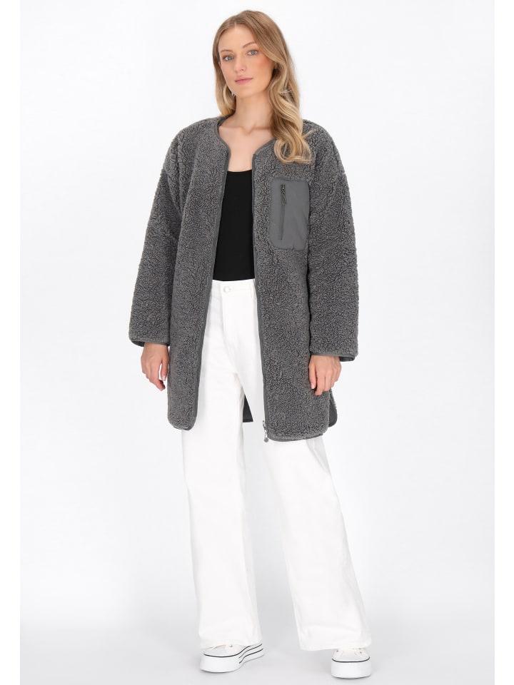 - Куртка свободного кроя с круглым вырезом и длинными рукавами