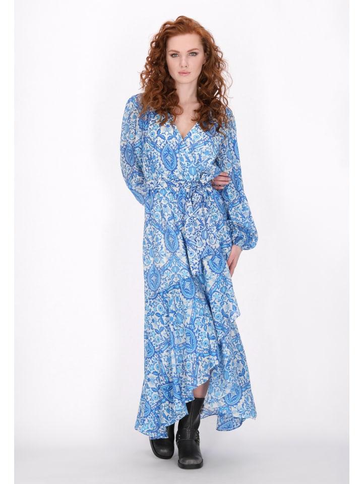 Добавьте нотку повседневного стиля в это стильное платье-халат из нашей коллекции Vintage. Оно отличается V-образным вырезом и длинными рукавами-фонариками, а также приталенным кроем с эластичной резинкой на талии для комфорта. Оборка по низу добавляет этому макси-платью шика, а декоративный принт дополняет его элегантный вид. Идеально подходит для повседневных выходов!