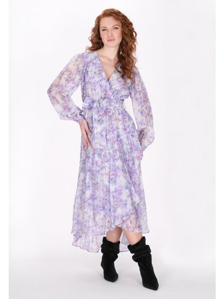 Это стильное платье-конверт с глубоким V-образным вырезом и расклешенными длинными рукавами-буфами, собранными на эластичные манжеты, создающие романтичный силуэт. Классический крой подчеркивает эластичную талию с тканевым поясом для комфорта. Это макси-платье с завязкой на талии добавляет женственности и идеально подходит для повседневных образов благодаря элегантному цветочному принту. Платье входит в коллекцию Fashion Look.
