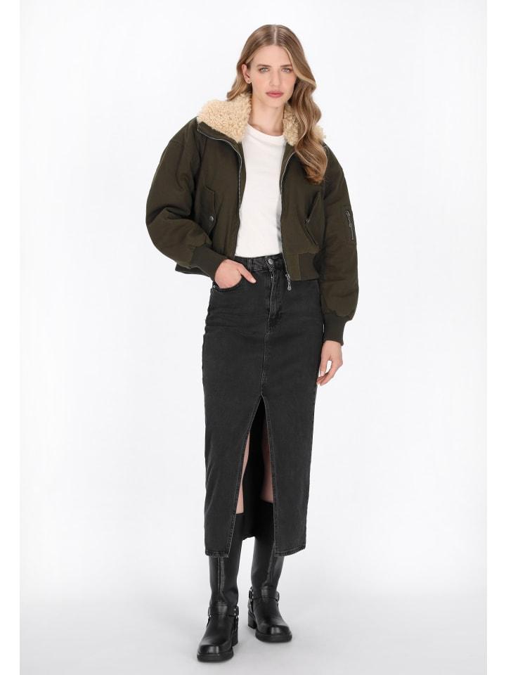 - Укороченная куртка свободного кроя с воротником-стойкой и длинными рукавами