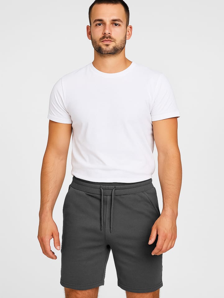 ---- Спортивные шорты EGO A\u0026S Мужские спортивные шорты с эластичным поясом EGO A\u0026S - удобные повседневные шорты ---- Изделие соответствует размеру. Материал: 80% хлопок, 20% полиэстер Посадка: стандартная Застежка: шнурок 9107 Инструкции по уходу: машинная стирка при 30 °C