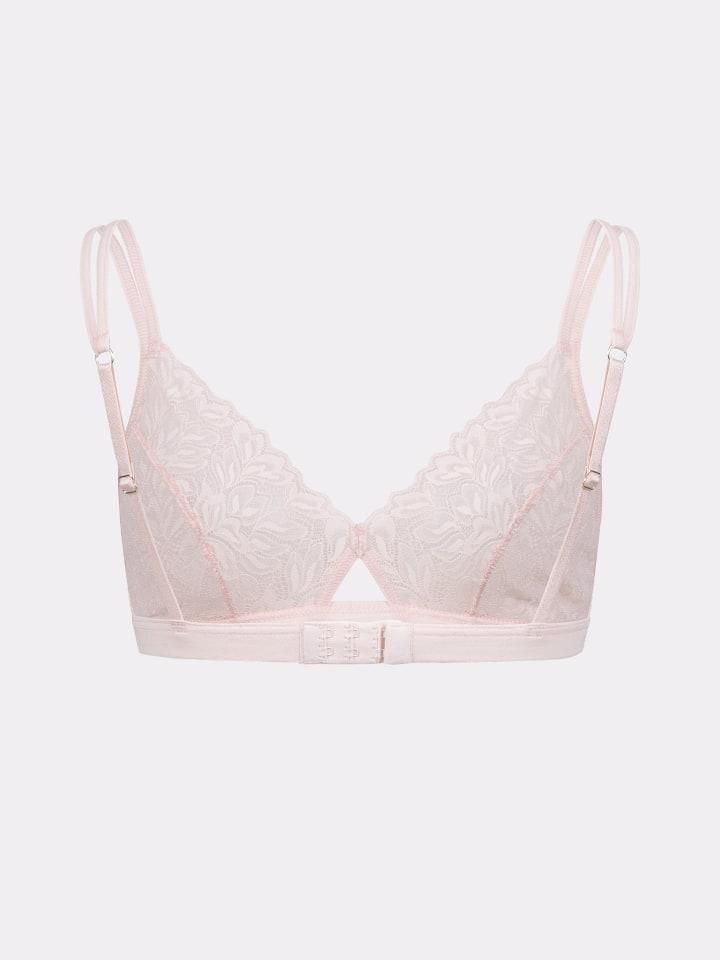 Вырез бюстгальтера с округлым глубоким V-образным вырезом и вырезом спереди по центру выполнен из тонкого кружева с растительным узором, обеспечивает легкую или среднюю поддержку.