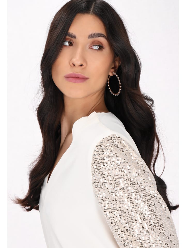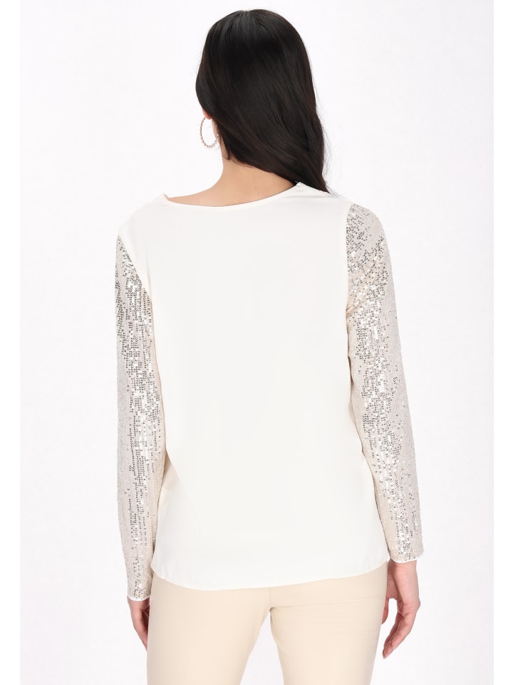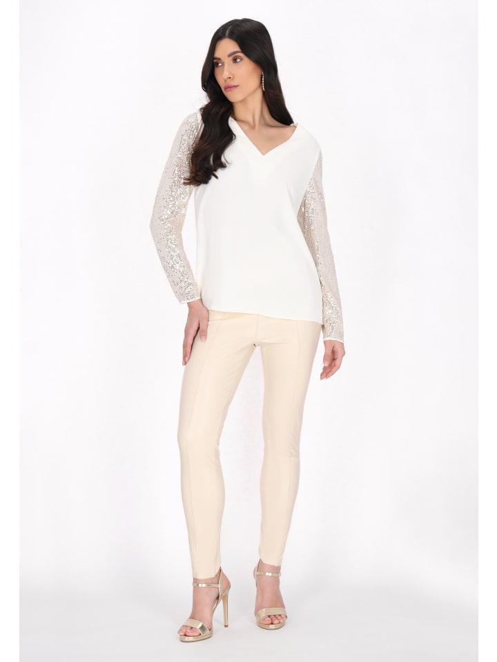 Откройте для себя стильную блузку для женщин прямого кроя с V-образным вырезом. Этот шикарный топ с длинными рукавами, украшенными пайетками, идеально дополнит ваш образ для вечеринки или мероприятия. Однотонная ткань красиво контрастирует с ослепительными акцентами на рукавах, делая эту блузку неотъемлемой частью коллекции Fashion Look.