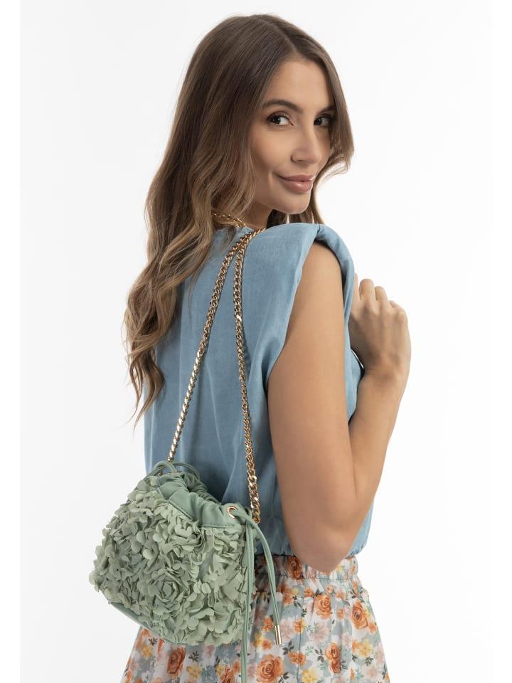 Представляем сумку-ведро с уникальным декором в виде лепестков, которая отличается мягким свободным силуэтом. Металлический ремешок-цепочка добавляет стиль и комфорт, а застежка на шнурок и внутренний карман на молнии обеспечивают функциональность. Эта сумка из экокожи с декоративной тканевой текстурой украшена лепестками цветов для стильного эффекта.