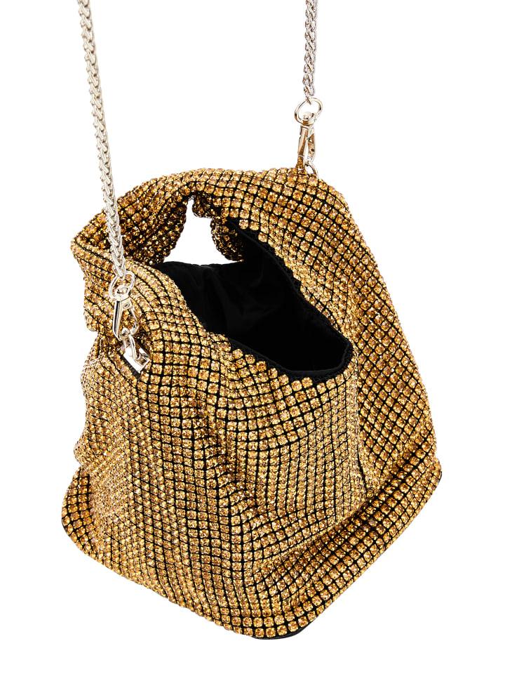 Откройте для себя очарование этой небольшой сумки-ведра с уникальным блестящим корпусом. Ее свободная форма излучает изысканность. Толстая верхняя ручка позволяет носить ее в руке, а съемный ремешок-цепочка добавит вечернего шика. Украшенная сверкающими стразами, она красиво сияет и украсит любой наряд.