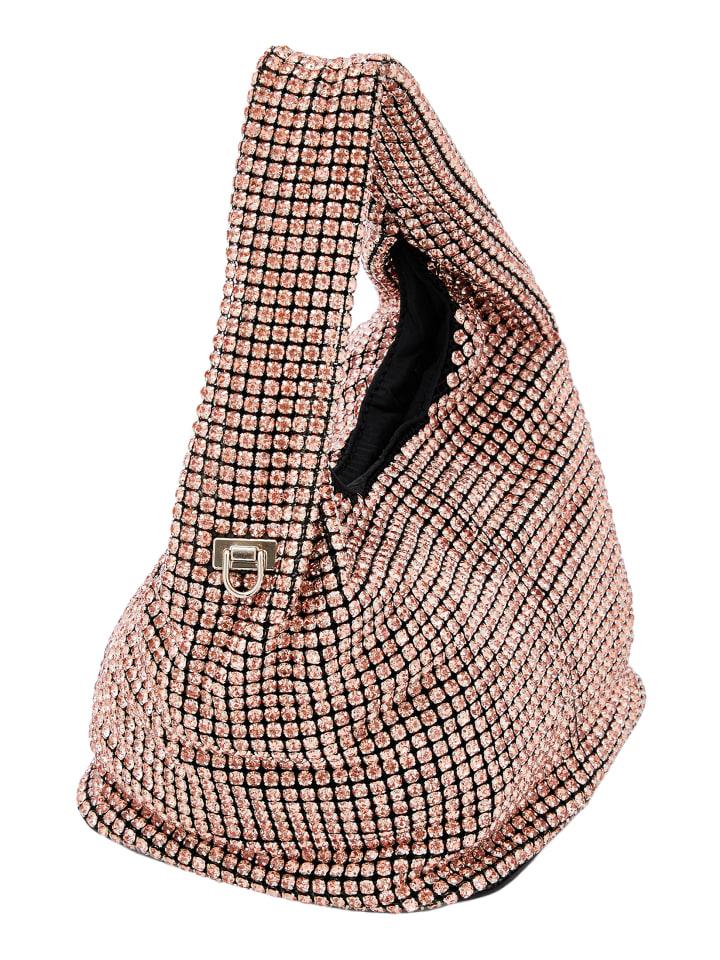 Откройте для себя очарование этой небольшой сумки-ведра с уникальным блестящим корпусом. Ее свободная форма излучает изысканность. Толстая верхняя ручка позволяет носить ее в руке, а съемный ремешок-цепочка добавит вечернего шика. Украшенная сверкающими стразами, она красиво сияет и украсит любой наряд.