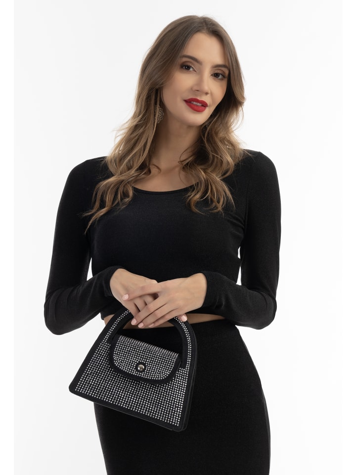 Откройте для себя эту элегантную сумочку уникальной полукруглой формы с плоским основанием для устойчивости. Передняя часть украшена декоративным клапаном на кнопке, украшенным сверкающими стразами. Благодаря регулируемым верхним ручкам и съемному ремню этот блестящий аксессуар из экокожи предлагает универсальные варианты ношения, излучая изысканность и стиль.