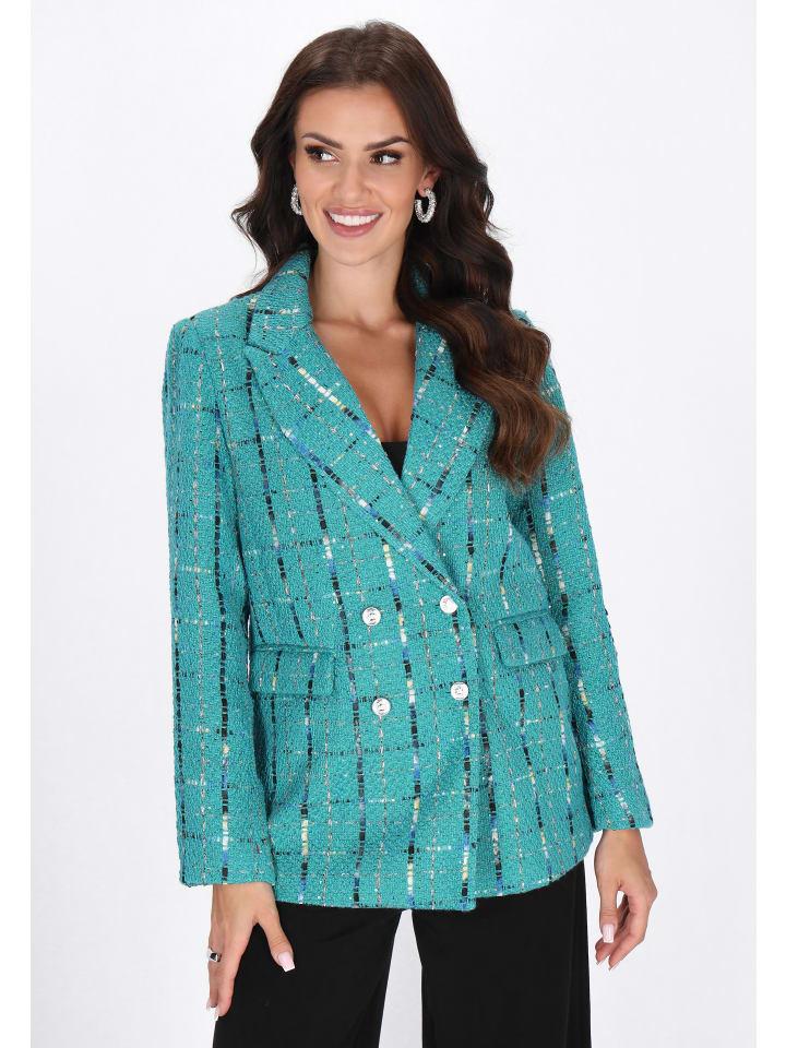 Стильный и элегантный жакет из коллекции Fashion Look - идеальный выбор для особых случаев. Изготовленный из плетеной ткани с добавлением металлизированной нити, он впечатляет своим легким блеском и классическим клетчатым узором. Модель прямого кроя имеет воротник с лацканами, V-образный вырез, длинные рукава и двубортную застежку на элегантные пуговицы. Карманы с клапанами добавляют практичности и изысканности.