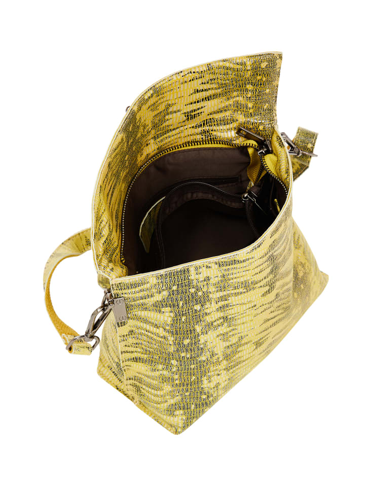 Откройте для себя сумку на плечо 110502-000064 - стильную сумку-трапецию среднего размера, сочетающую в себе функциональность и элегантность. Верхняя ручка и регулируемый ремень обеспечивают универсальность при переноске. Клапан застегивается на молнию и оснащен внутренним карманом на молнии для надежного хранения. Эта блестящая кожаная сумка, дополненная брелоком с кисточкой, украшена модным узором в виде змеи.