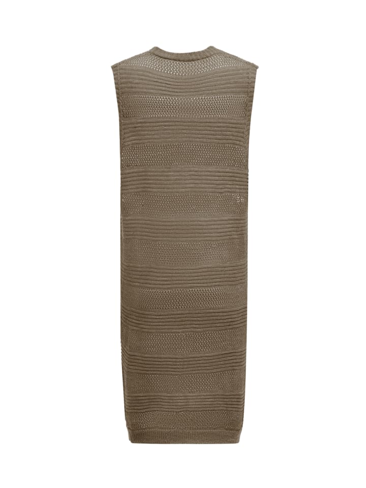 Этот жилет без рукавов, созданный для непринужденного многослойного ношения, имеет текстурированный трикотаж с горизонтальными полосами, которые придают ему глубину и объем. V-образный вырез и открытый перед делают его универсальным и подходят для различных образов. Благодаря сочетанию ажурных и плотных узоров этот свободный силуэт прекрасно ложится, создавая шикарный образ. Разработанный совместно с LEOMIA, этот жилет сочетает в себе классический стиль и современный дизайн.