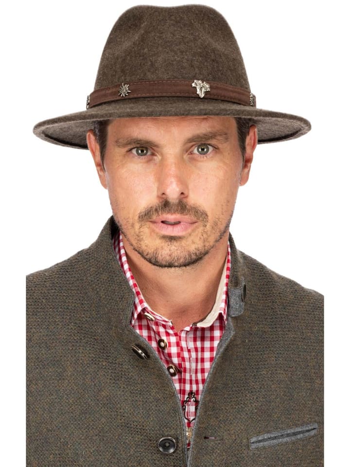 Коричневая традиционная шляпа от Faustmann. Эта привлекательная традиционная шляпа классического дизайна изготовлена из высококачественной валяной шерсти. Широкие поля по всему периметру защищают от дождя и солнца. Коричневая модель хорошо сочетается с другими натуральными цветами и идеально подходит к традиционной одежде из лодена. Лента с маленькими металлическими цветами - настоящая находка.