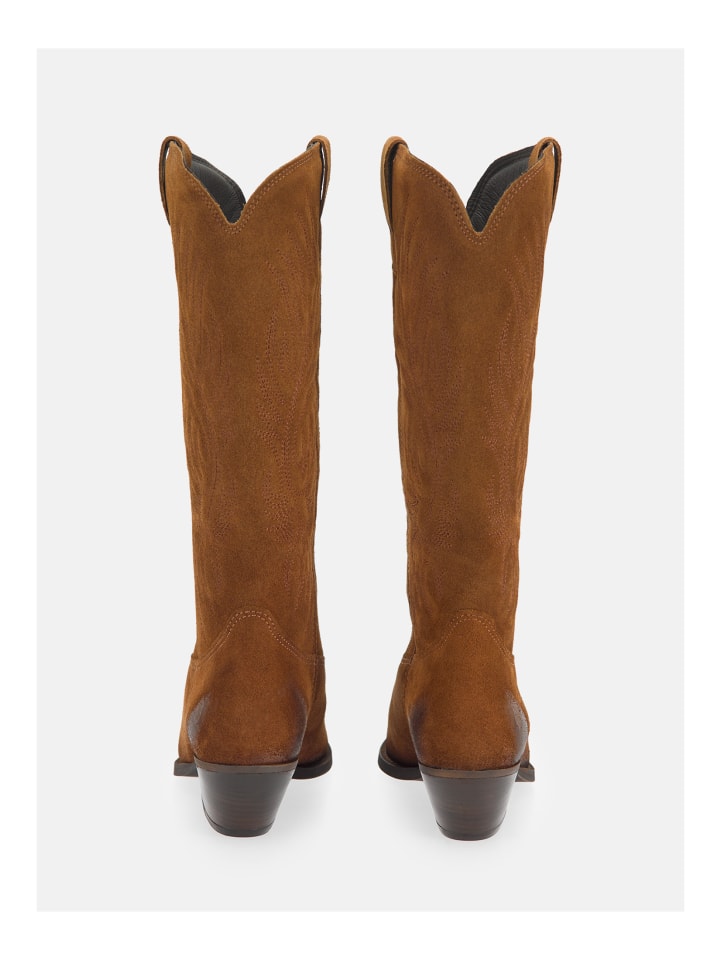 SELMA D346 от Felmini - классические сапоги в стиле вестерн из мягкой замши с изысканной вышивкой на голенище, создающие классический ковбойский образ. Каблук средней высоты обеспечивает привлекательный подъем, а мягкая стелька гарантирует длительный комфорт. Идеальное сочетание деревенского очарования и повседневной практичности.