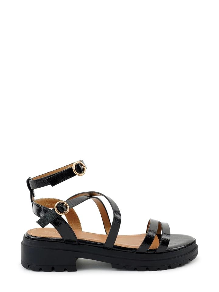 С сандалиями KAIA от FINDLAY ваш день начнется блестяще - в прямом смысле этого слова. Эти черные сандалии из высококачественной лакированной искусственной кожи сочетают в себе городской уличный стиль и утонченную элегантность. Перекрещенные ремешки, эффектная платформа и золотые пряжки придают обуви уверенный вид. KAIA - идеальный спутник для расслабленных городских дней или спонтанных моментов после работы.