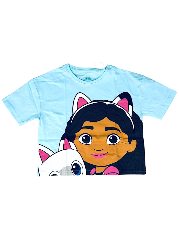 На короткой футболке изображена веселая Габби со своим другом-кошкой на светлом фоне, а в комплекте идут шорты с милым рисунком в виде лапок.