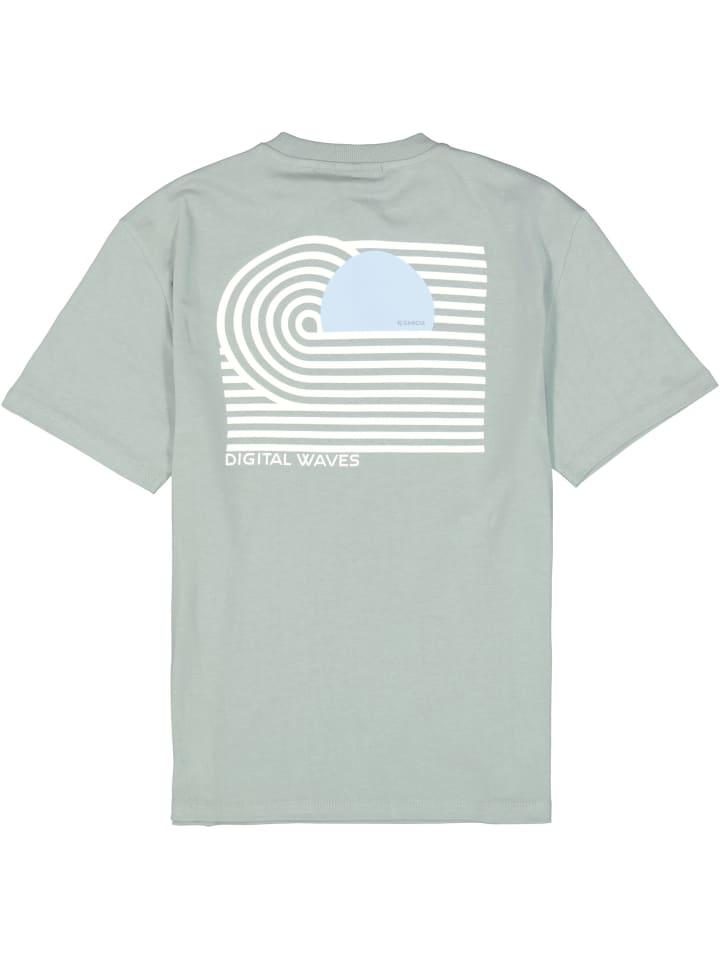 Футболки Garcia для мальчиков-подростков в светло-шалфейном и бежево-белом цветах сочетают в себе экологичные материалы и стильный дизайн. Изготовленные из 70% хлопка и 30% переработанного хлопка, они экологичны и комфортны. Современный принт на спине с цифровым рисунком волн придает им модный и молодежный вид. Благодаря классическому крою и круглому вырезу они универсальны для школы, отдыха и летних мероприятий и легко сочетаются с разным низом и обувью.