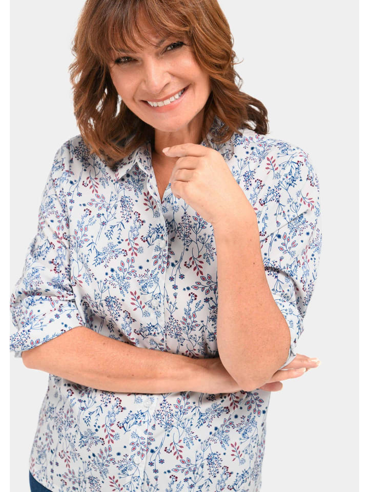 Блузка с принтом красивого классического кроя с рубашечным воротником, застежкой на пуговицы по всей длине и длинными рукавами, заканчивающимися манжетами на одной пуговице. Эта универсальная модель украшена очаровательным цветочным узором. Пуговицы идеально сочетаются по цвету. Блузка имеет прямой подол и выполнена из приятной, немнущейся ткани. Длина: около 66 см для размера 46, около 62 см для размера 23. Рост модели: 174 см, размер 38. - Красивый принт по всей поверхности. - Не требует особого ухода и не мнется. - Идеально садится по фигуре. Материал: 100% полиэстер.