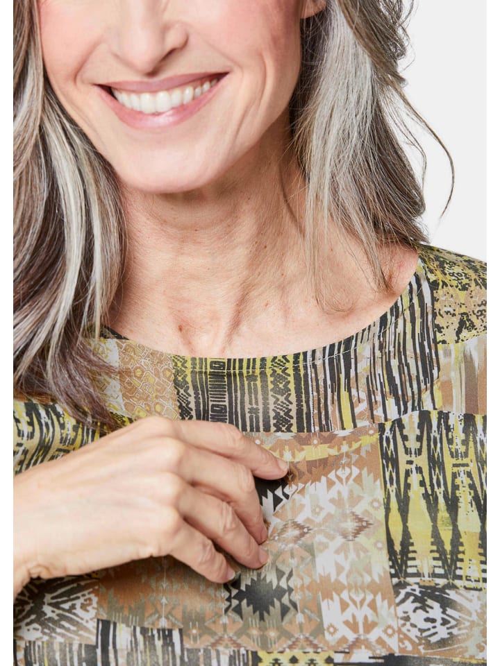 Блузка длиной до бедер с красивым разноцветным принтом. Этот модный фасон дополняет женственный круглый вырез и спущенные плечи. Разрезы по бокам обеспечивают оптимальную свободу движений. Удобная и легкая хлопковая вуаль. Длина около 66 см для размера 46.