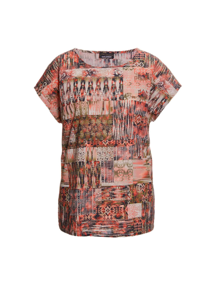 Блузка длиной до бедер с красивым разноцветным принтом. Этот модный фасон дополняет женственный круглый вырез и спущенные плечи. Разрезы по бокам обеспечивают оптимальную свободу движений. Удобная и легкая хлопковая вуаль. Длина около 66 см для размера 46.