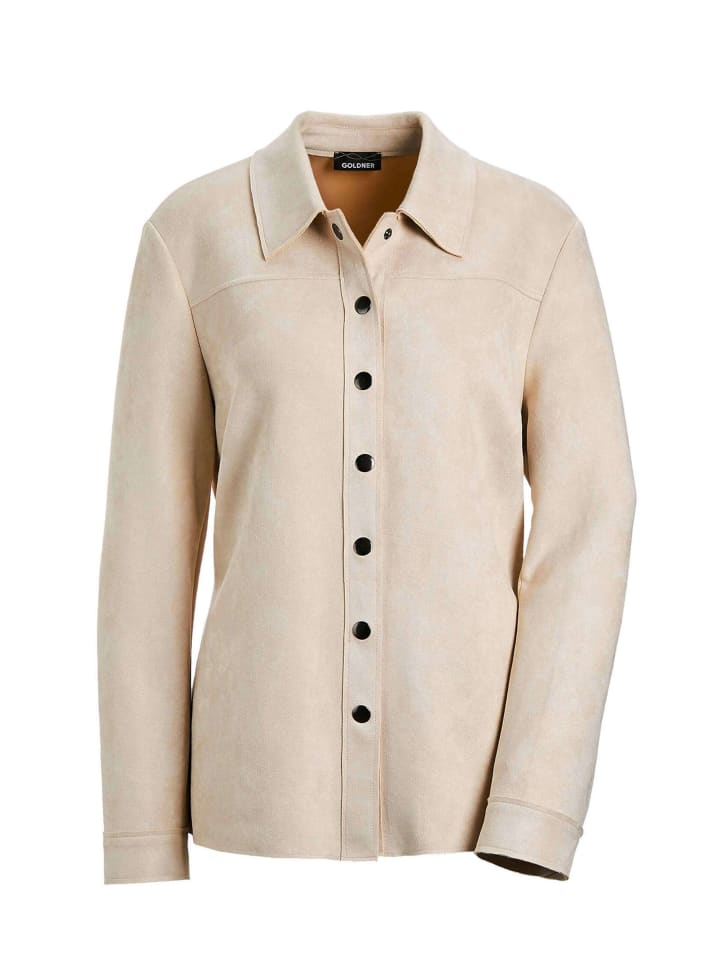 Куртка-рубашка из замши. Мягкая на ощупь, эластичная ткань делает куртку невероятно удобной в носке. Кокетка спереди и сзади, а также манжеты добавляют стильные акценты. Застегивается на кнопки. Практичные карманы в боковых швах дополняют дизайн. Куртка без подкладки - универсальный аксессуар, который можно носить и как рубашку. Длина: около 67 см для размера 46, около 63 см для размера 23.