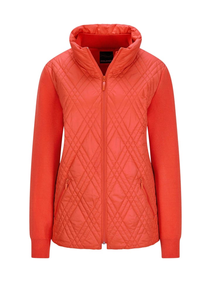 Куртка из интересного сочетания материалов: перед и спинка выполнены из легкой стеганой ткани с подкладкой и удивительным узором, который согревает. Вязаные рукава приятны на ощупь и обеспечивают полную свободу движений. Двойной воротник-стойка с трикотажной подкладкой согревает шею. Застежка-молния, два кармана на молнии и два внутренних кармана. Длина: около 69 см для размера 46, около 65 см для размера 23.