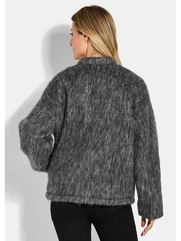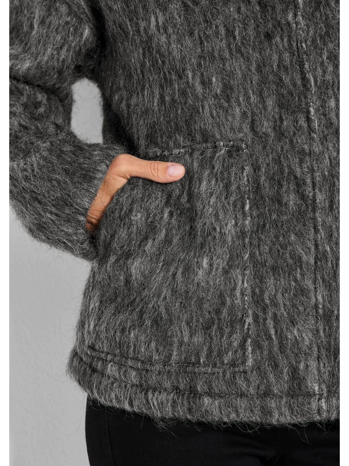Куртка из длинноволокнистой ткани с большим содержанием шерсти - мохнатый, пестрый серый мех не только выглядит теплым, но и действительно теплым! Слегка свободный, удобный крой, спущенная линия плеча и длинные рукава идеально подходят для толстых зимних свитеров. Круглый вырез, потайная планка на кнопках и большие накладные карманы придают изделию на подкладке спортивный вид. Длина: около 67 см для размера 46, около 63 см для размера 23.