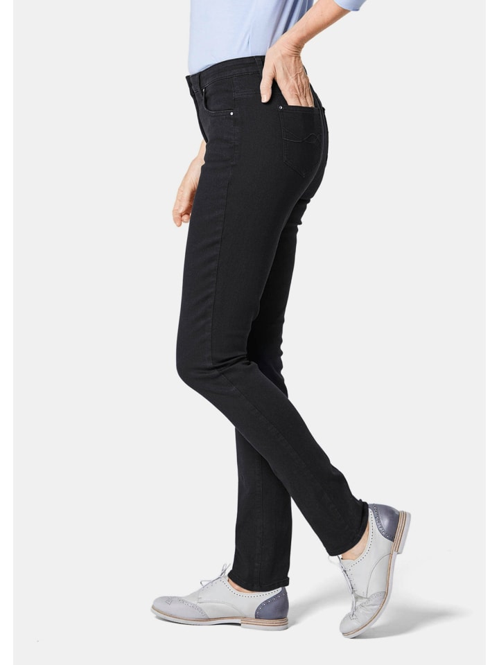 Джинсы BELLA с фасонным поясом: несравненный комфорт благодаря особо высокой эластичности. Функциональная ткань, биэластичная, высокого качества, создает отличный силуэт. Эта модель не сковывает движений и подходит для любых видов деятельности, даже для походов - идеальный повседневный спутник! Классический крой с пятью карманами, шлевками для ремня и небольшими заклепками. Ширина нижнего края около 32 см. Очень узкие штанины.