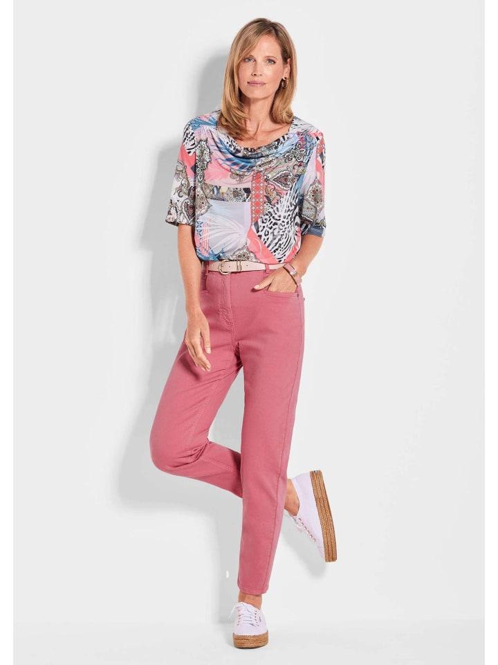 Брюки SARA с фигурным поясом и шлевками для ремня. Удлиненные в области бедра и суженные к низу брюки. Джинсы из цветного хлопкового денима с эластаном обеспечивают полную свободу движений. Изящно декорированы тональной вышивкой и стразами на задних карманах, а также декоративными заклепками на карманах. Двойные швы. С легкой потертостью. Ширина нижнего края около 34 см. Зауженные книзу штанины.