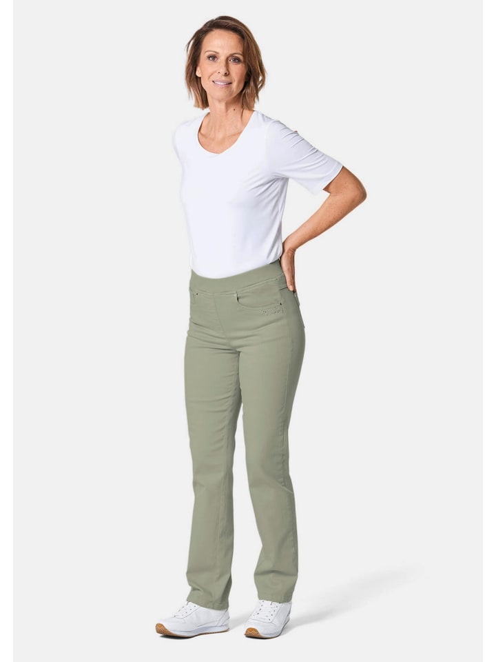 Джинсы LOUISA pull-on и джинсы pull-on длиной 3/4 в популярном стиле с пятью карманами: закругленные передние карманы украшены элегантным мотивом из стразов и небольшим кармашком для монет. Задние карманы украшены изящной вышивкой. Широкий эластичный трикотажный пояс обеспечивает высокий уровень комфорта и отлично выглядит. Наслаждайтесь комфортным качеством благодаря большому количеству натурального хлопка и эластана. Ширина подола около 40 см. Ширина брючины прямая.