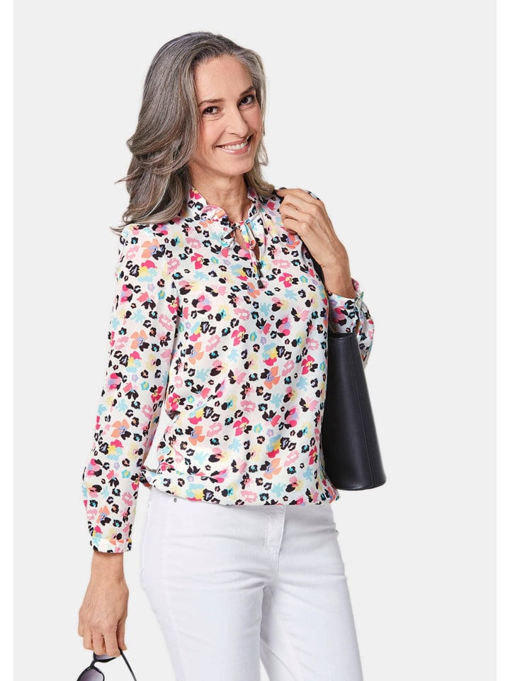 Блузка с эффектным разноцветным принтом на комфортной, струящейся ткани. Свободный крой выгодно подчеркивает фигуру, а женственный V-образный вырез визуально удлиняет фигуру. Воротник-стойка с оборкой, манжеты с небольшими разрезами и эластичный подол. Длина: около 69 см для размера 46, около 65 см для размера 23.