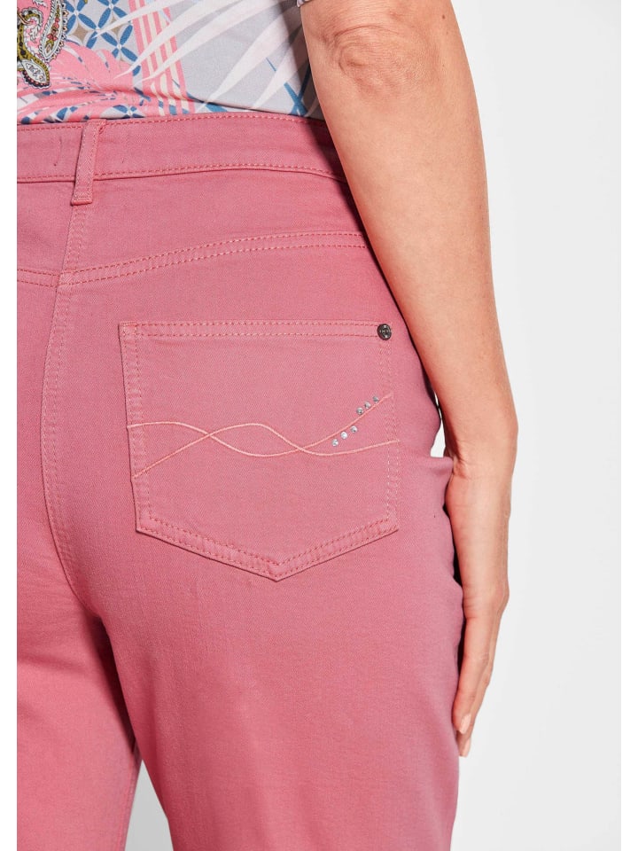 Брюки SARA с фигурным поясом и шлевками для ремня. Брючина обеспечивает комфортную ширину в области бедра и сужается к низу. Джинсы из цветного хлопкового денима с эластаном обеспечивают полную свободу движений. Изящно декорированы тональной вышивкой и стразами на задних карманах, а также декоративными заклепками на карманах. Двойные швы. С легкой потертостью. Ширина нижнего края около 34 см. Зауженные книзу штанины.