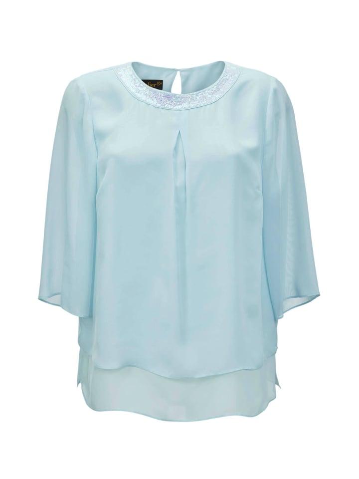 Блузка из красивого, воздушного шифона. Высококачественная двухслойная ткань мягко колышется при каждом движении. Особое внимание привлекает круглый вырез горловины, украшенный яркими радужными пайетками и бисером, а также с моделирующей складкой. Длина рукава ¾, застежка сзади для удобства надевания. Длина около 69 см для размера 46, около 65 см для размера 23.