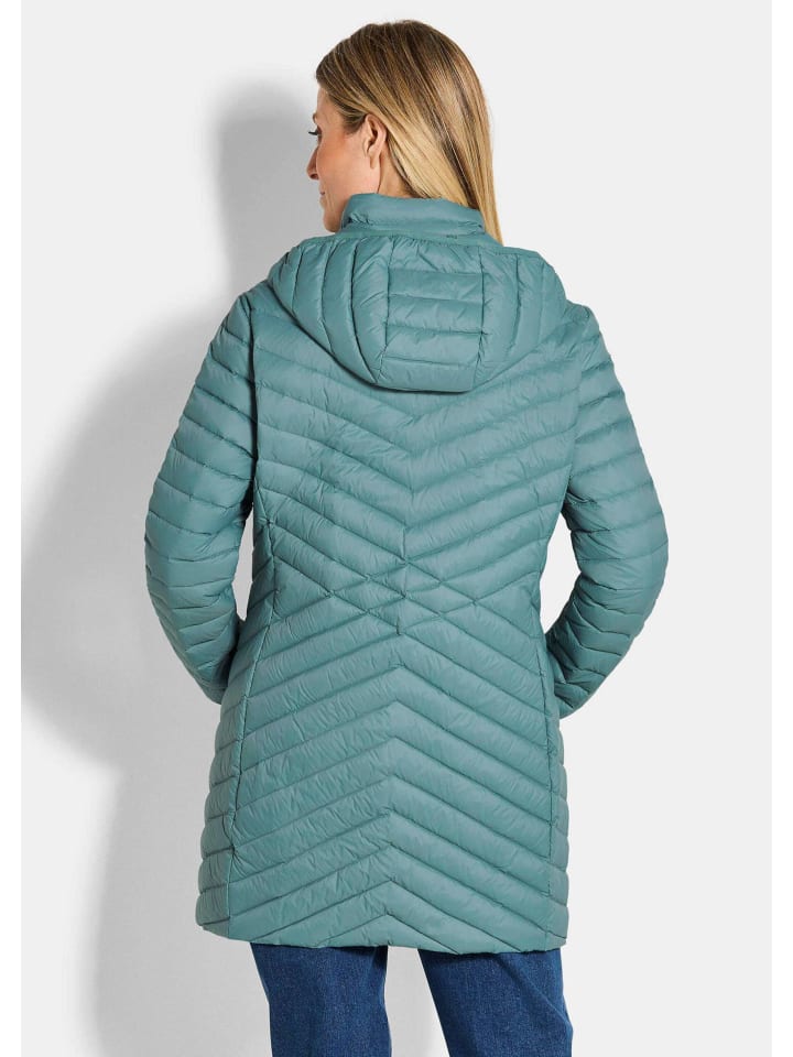 Стеганое пальто с теплым наполнителем из пуха и пера - очень легкое и идеально подходит для путешествий! Удлиненный крой с воротником-стойкой и капюшоном обеспечивает полное тепло, а двусторонняя молния обеспечивает максимальный комфорт даже сидя. Эластичные манжеты на капюшоне и карманах. Изящная стежка создает женственный образ. Длина: около 83 см для размера 46, около 79 см для размера 23.