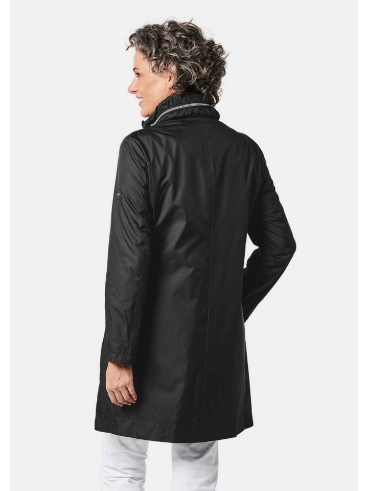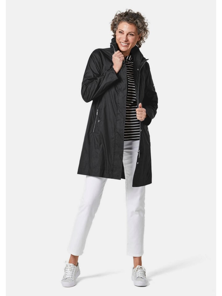 Длинная куртка с утонченным А-образным кроем и эксклюзивной легкой подкладкой: матовый, изысканный блеск придает этому функциональному, ветро- и дождезащитному компаньону элегантный шарм. Капюшон скрыт в воротнике, который также отделан модными сборками для удобной посадки. Застежка на молнию и кнопку, два декоративных клапана, карманы на молнии и внутренние карманы на подкладке. Модель чрезвычайно легкая и дышащая, ее также можно носить поверх блейзера. Длина около 93 см для размера 46, около 89 см для размера 23.