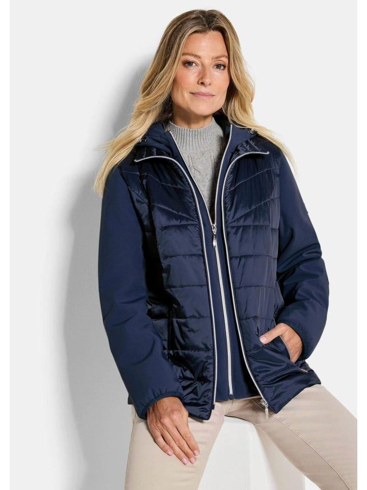 Стеганая куртка из смеси материалов: перед и спинка из слегка блестящей стеганой ткани, рукава из матового софтшелла. Куртка оснащена съемной вставкой из софтшелла, которая, наряду с воротником-стойкой и капюшоном, обеспечивает дополнительное тепло. Капюшон с регулируемыми эластичными манжетами, карманы на молнии. Стеганая подкладка контрастного цвета; рукава также на подкладке. Длина: около 67 см для размера 46, около 63 см для размера 23.