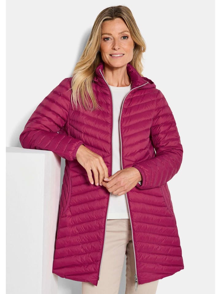 Стеганое пальто с теплым наполнителем из пуха и пера - очень легкое и идеально подходит для путешествий! Удлиненный крой с воротником-стойкой и капюшоном обеспечивает полное тепло, а двусторонняя молния обеспечивает максимальный комфорт даже сидя. Эластичные манжеты на капюшоне и карманах. Изящная стежка создает женственный образ. Длина: около 83 см для размера 46, около 79 см для размера 23.