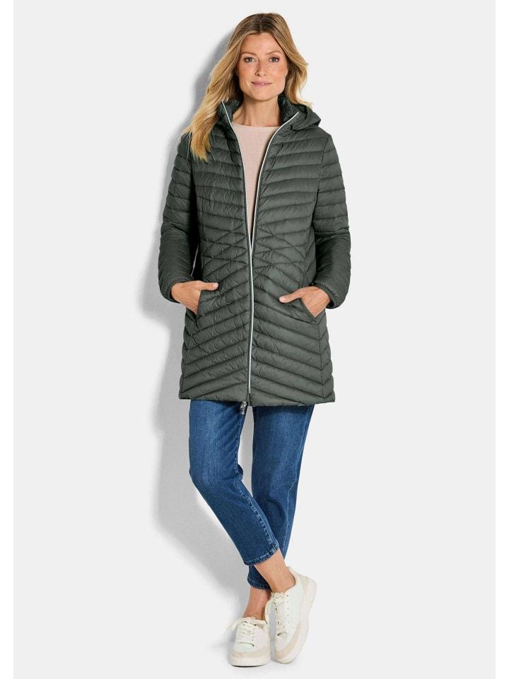 Стеганое пальто с теплым наполнителем из пуха и пера - очень легкое и идеально подходит для путешествий! Удлиненный крой с воротником-стойкой и капюшоном обеспечивает полное тепло, а двусторонняя молния обеспечивает максимальный комфорт даже сидя. Эластичные манжеты на капюшоне и карманах. Изящная стежка создает женственный образ. Длина: около 83 см для размера 46, около 79 см для размера 23.