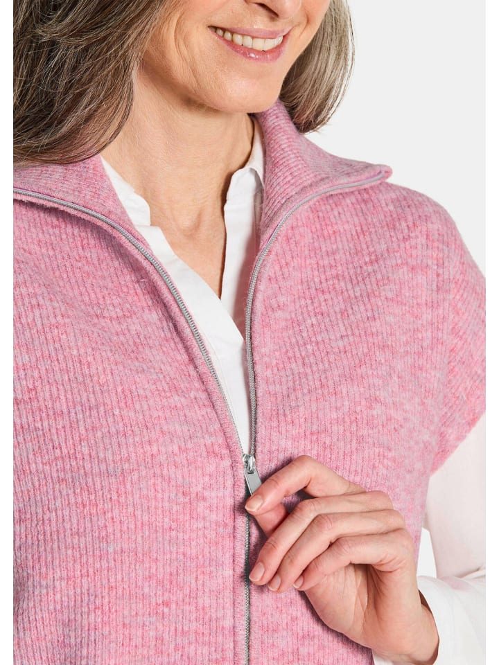 Вязаный жилет в стиле пуловера! Свободный крой со спущенными плечами идеально подходит для блузки или рубашки. Благодаря потайной молнии с трикотажной резинкой на подкладке жилет можно носить как расстегнутым, так и застегнутым. Мягкий широкий воротник позволяет носить его как водолазку, так и отложным воротником. Изготовлен из легкой в уходе смесовой пряжи меланжевого цвета, а мелкая ребристая структура придает жилету уютный и комфортный вид. Длина: около 65 см для размера 46, около 61 см для размера 50. 23.