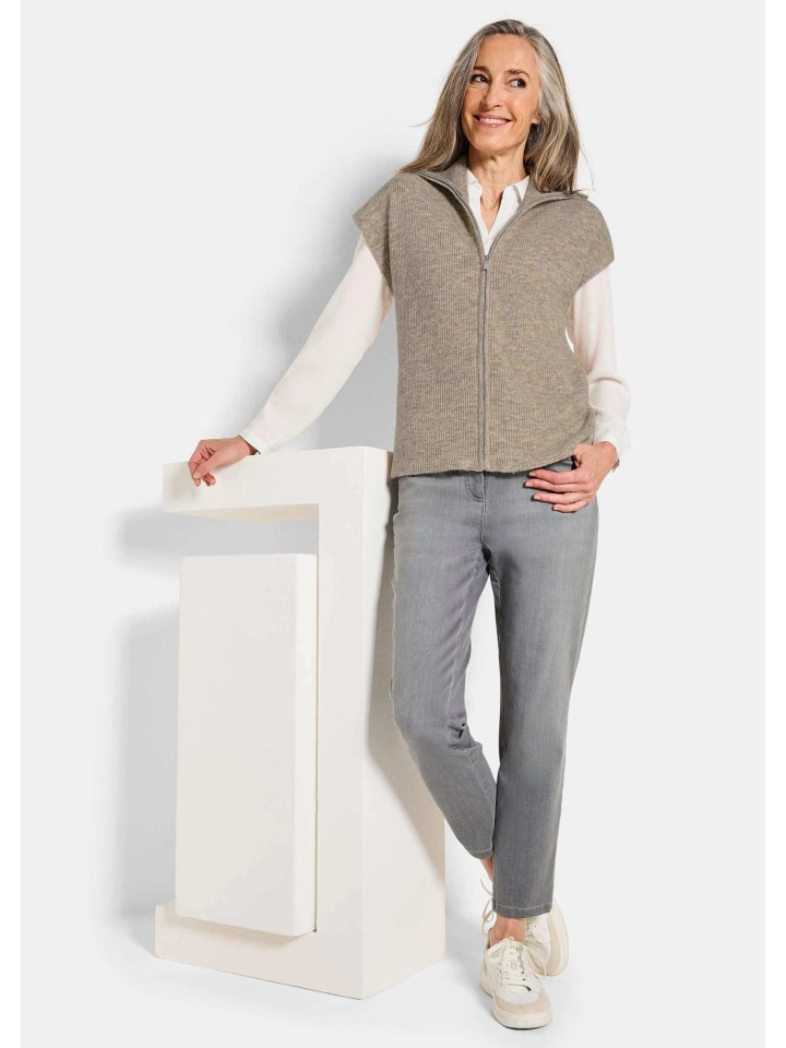 Вязаный жилет в стиле пуловера! Свободный крой со спущенными плечами идеально подходит для блузки или рубашки. Благодаря потайной молнии с трикотажной резинкой на подкладке жилет можно носить как расстегнутым, так и застегнутым. Мягкий широкий воротник позволяет носить его как водолазку, так и отложным воротником. Изготовлен из легкой в уходе смесовой пряжи меланжевого цвета, а мелкая ребристая структура придает жилету уютный и комфортный вид. Длина: около 65 см для размера 46, около 61 см для размера 50. 23.