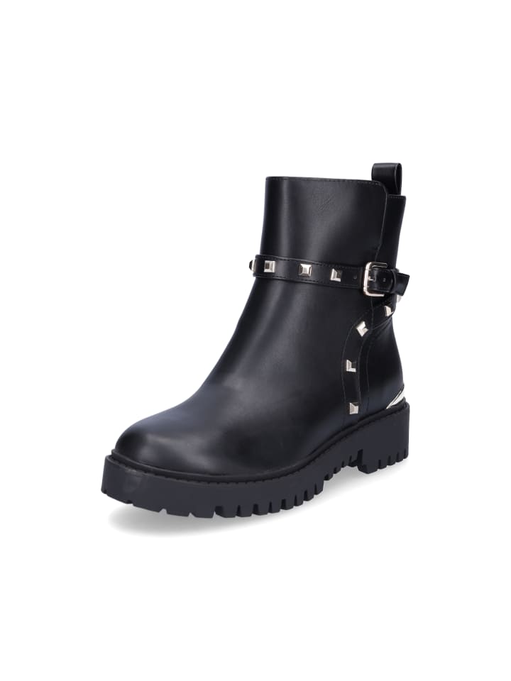 Женские ботинки Guess из гладкой искусственной кожи черного цвета с застежкой-молнией, золотистыми заклепками и легкой текстильной подкладкой.