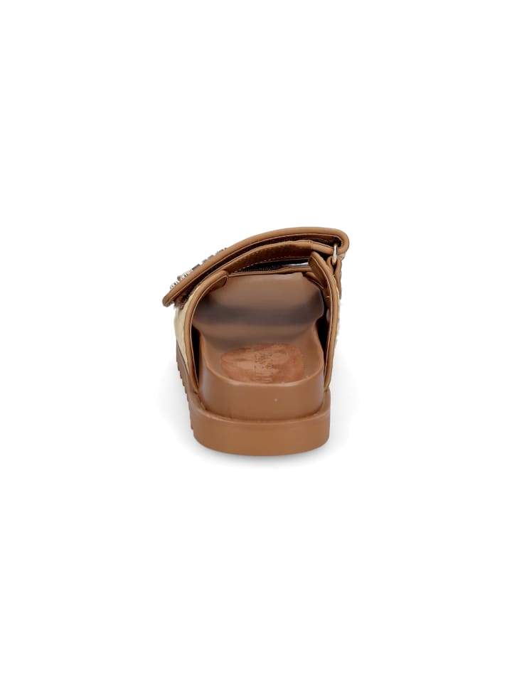 Женские бежевые мюли Guess из рафии с золотой надписью Guess и двумя застежками-липучками.