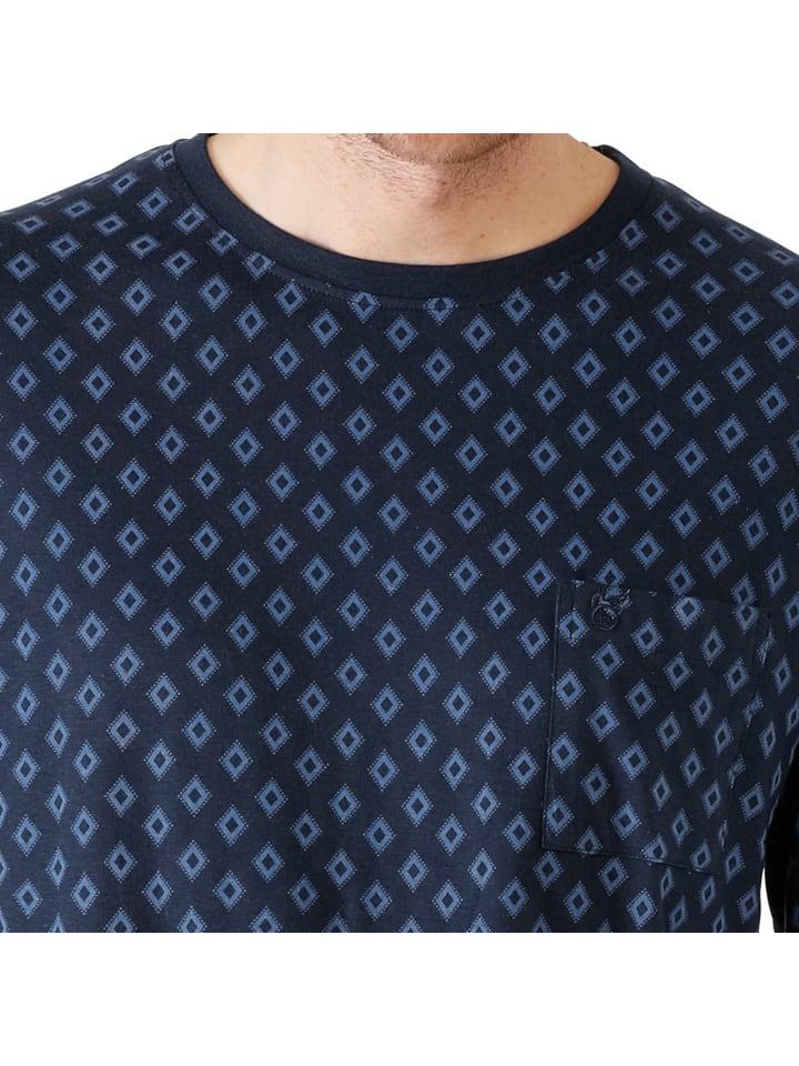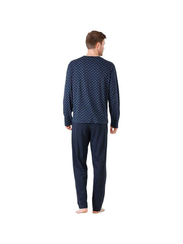 Мужская пижама Hajo из трикотажного полотна. Эта уютная пижама обеспечит спокойные вечера и спокойные ночи. Верхняя часть украшена красивым принтом по всей поверхности, имеет круглый вырез, вышитый логотип на нагрудном кармане и боковые разрезы. Пижама сочетается с однотонными длинными брюками со стеганым эластичным поясом, кулиской и боковыми карманами. Мягкий, изящно струящийся материал впечатляет своим превосходным комфортом при ношении и мягкостью на ощупь.