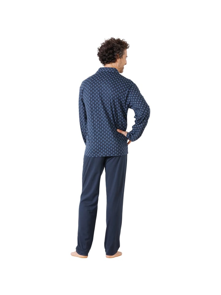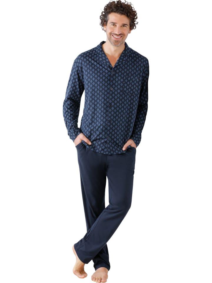 Мужская пижама Hajo из трикотажного полотна. Эта стильная пижама классического кроя обеспечит расслабленные вечера и спокойные ночи. Верх украшен красивым принтом по всей поверхности, воротником с лацканами, застежкой на пуговицы по всей длине, вышитым нагрудным карманом с логотипом и боковыми разрезами. Дополняется простыми длинными брюками со стеганым эластичным поясом, кулиской и боковыми карманами. Мягкий, изящно струящийся материал впечатляет своим превосходным комфортом при ношении и мягкостью на ощупь.