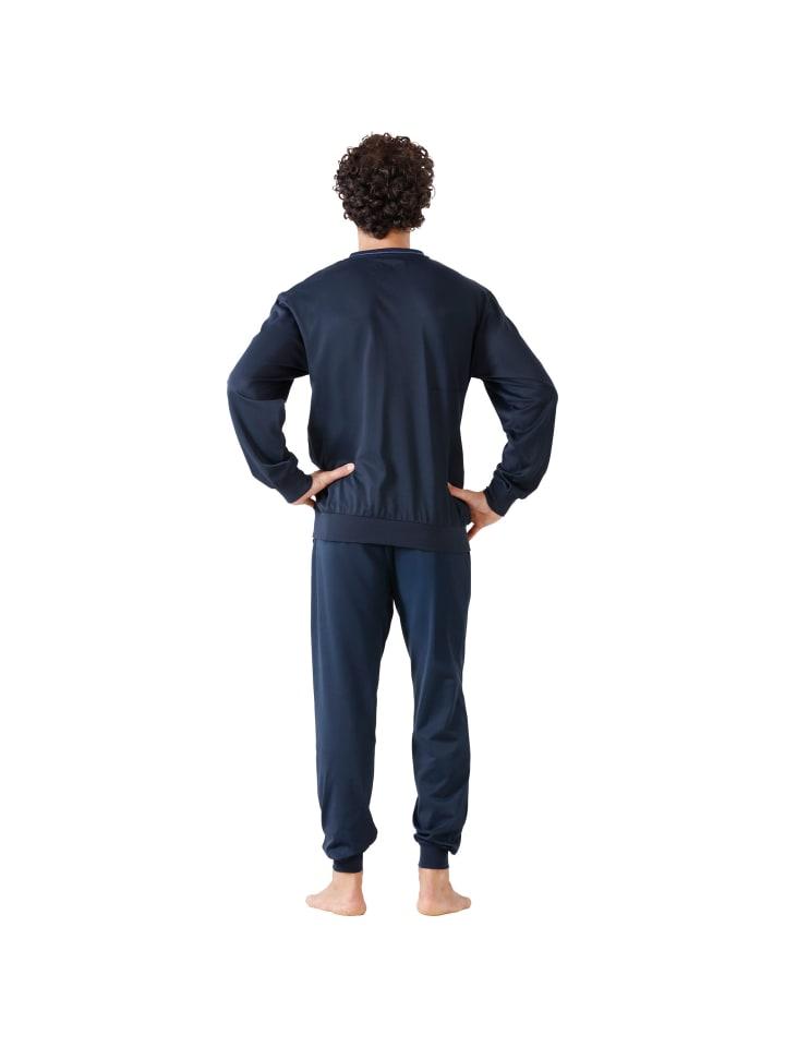 Мужская пижама Hajo из однотонного трикотажа. Комфортное качество для сбалансированного микроклимата во время сна. Это функциональное волокно сочетает в себе преимущества удивительно мягкого мерсеризованного суперчесаного хлопка и простого в уходе полиэстера. В результате получается тонкий, слегка блестящий материал, который не только приятен для кожи, терморегулирует и дышит, но также прост в уходе и не требует глажки. Верх с V-образным вырезом и вышитым нагрудным карманом с логотипом дополнен трикотажными полосками на груди. В комплекте однотонные брюки с притачным эластичным поясом, кулиской и боковыми карманами. С манжетами на рукавах, подоле и штанинах. Удобный крой и качественная обработка создают хорошую основу для спокойного сна.