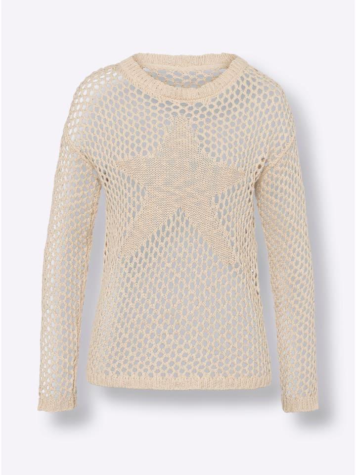 Ажурный вязаный свитер со звездным узором. Круглый вырез, спущенная линия плеча, длинные рукава и ребристые манжеты. Поддерживает инициативу Хлопок, сделанный в Африке.